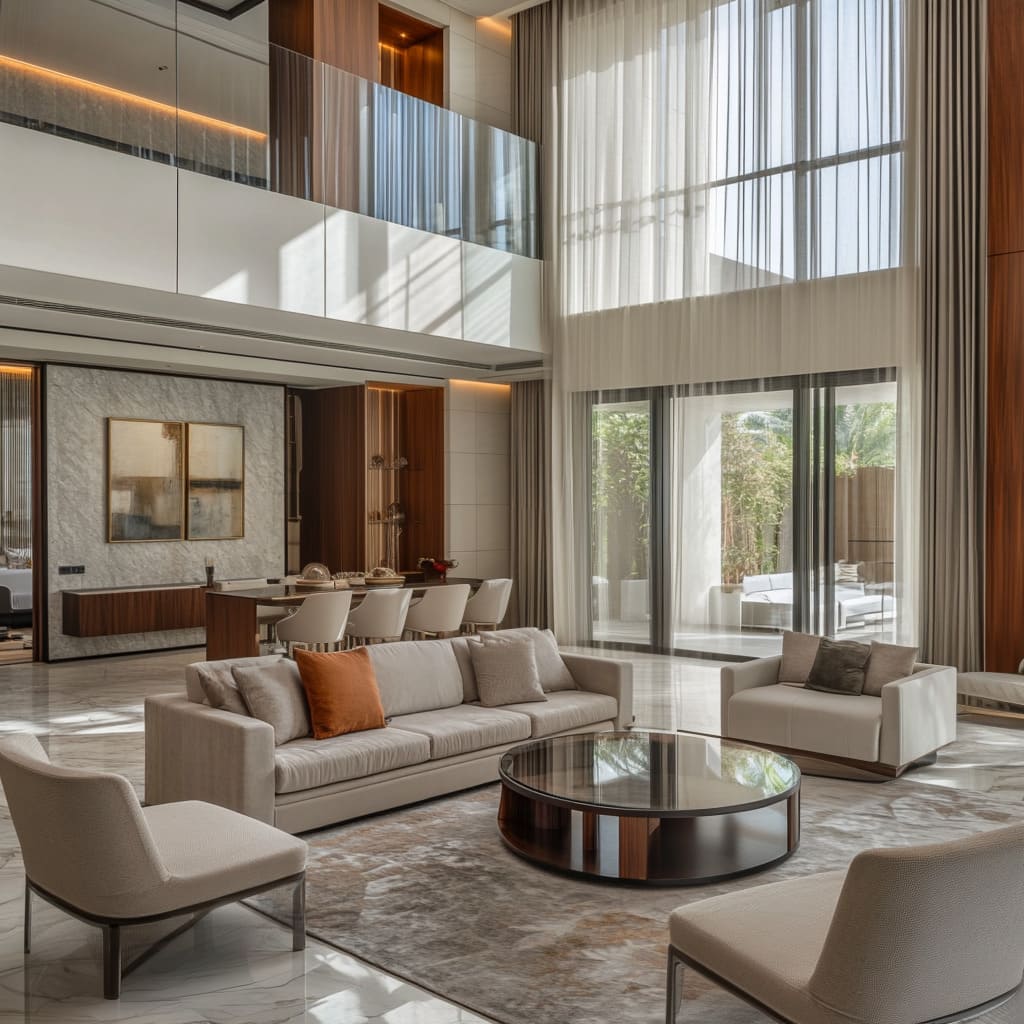 One of the most defining features of modern Dubai villas is the use of double-height ceilings. This architectural element is more than just a stylistic choice; it serves to amplify the sense of space within the home, creating a grand, open atmosphere that is both impressive and welcoming. These towering ceilings allow for expansive windows, which flood the interiors with natural light and create a seamless connection between the indoors and outdoors.