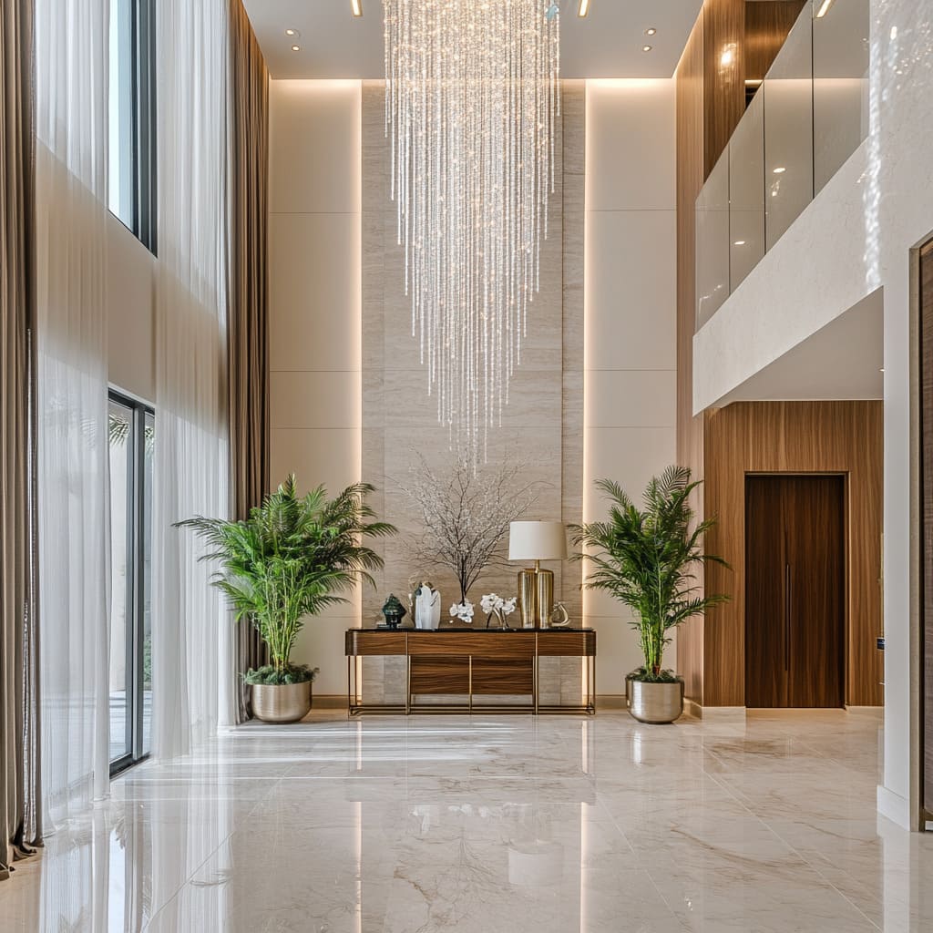 Lighting is a key element in the design of modern Dubai villas, with statement fixtures playing a prominent role. Chandeliers are often used in main halls and living areas, where their size and design make a lasting impression. These fixtures range from classic crystal designs to modern, abstract forms, each chosen to complement the overall style of the space. The placement of chandeliers is strategic, often centered in rooms with high ceilings to draw the eye upward and enhance the sense of scale.